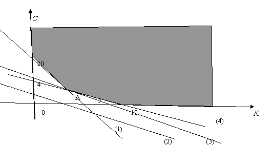 Следовательно, область допустимых значений параметров (К, С) является неограниченной сверху. Из всей плоскости она выделяется осями координат (лежит в первом квадранте) и прямыми (1) и (4) (лежит выше этих прямых, а также включает граничные отрезки). Область допустимых значений параметров, т.е. точек (К, С), можно назвать "неограниченным многоугольником". Минимум целевой функции 3,8 К + 4,2 С может достигаться только в вершинах этого "многоугольника". Вершин всего три. Это пересечения с осями абсцисс (10,0) и ординат (0,20) прямых (1) и (4) (в каждом случае из двух пересечений берется то, которое удовлетворяет обоим ограничениям). Третья вершина - это точка А пересечения прямых (1) и (4), координаты которой находятся при решении системы уравнений