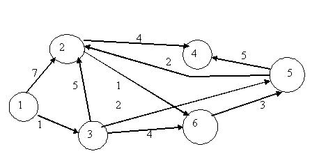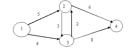 Для решения этой задачи каждой дуге ориентированного графа, соответствующего транспортной системе, должно быть сопоставлено число - пропускная способность этой дуги. Рассмотрим пример (рис.8).