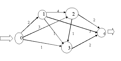 Далее надо добиться, чтобы все 6 вышедших из пункта 0 единиц груза достигли конечного пункта 4. Очевидно, 2 единицы груза, пришедшие в пункт 1, можно непосредственно направить в пункт 4. Пришедшие в пункт 2 грузы придется разделить: 2 единицы сразу направить в пункт 4, а 1 единицу - в промежуточный пункт 3 (из-за ограниченной пропускной способности участка между пунктами 2 и 4). В пункт 3 доставлены такие грузы: 1 единица из пункта 0 и 1 единица из пункта 2. Их направляем в пункт 4.