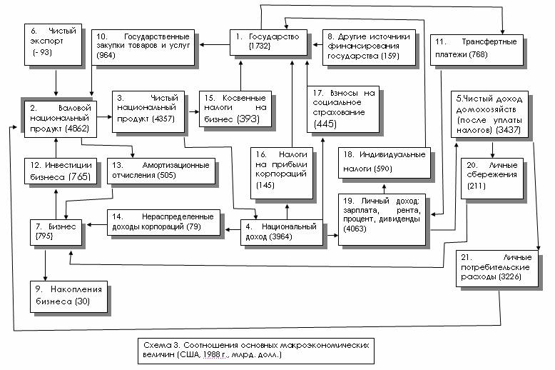 В 1988 г. валовой национальный продукт (ВНП) США составлял 4862 миллиарда долларов. В дальнейшем указания на единицу измерения (миллиард долларов) будем опускать. Основные хозяйствующие субъекты - это государство, бизнес и домохозяйства (семьи, конечные потребители).