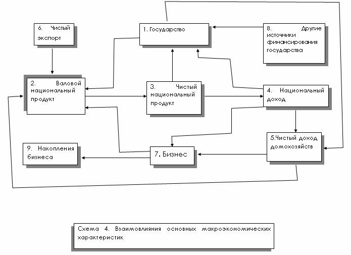 В качестве примера возьмем классическую систему макроэкономических характеристик (в соответствии с классической монографией К.Р.Макконнелл, С.Л.Брю [6, с.136-145]). Основная схема на с.144 не может быть непосредственно использована, поскольку в ней два блока могут быть связаны финансовыми потоками, идущими в противоположных направлениях (например, государство изымает из личных доходов индивидуальные налоги, но при этом направляет в личные доходы трансфертные платежи). Кроме того, часть информации на указанной схеме приведена не при описании макроэкономических характеристик, а при рассмотрении финансовых потоков.