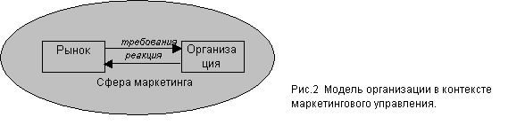 Все это означает, что маркетинг является не функциональным эпизодом процесса управления, а его базой. Модель организации в контексте маркетингового управления с этой точки зрения может быть представлена в виде: