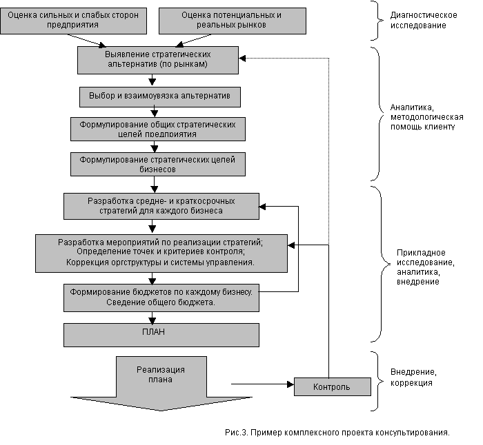 Консультирование применяется предприятиями для решения множества задач, обусловленных особенностями рыночной ситуации, спецификой конкретных предприятий, ресурсами, целями, и т.д. Рынок для каждого предприятия и сами предприятия уникальны. Точно также уникальны проекты, выполняемые консультантами, комплекс методов и действий, применяемый в каждом случае. Системный проект, выполняемый для клиента, может содержать, например, следующий спектр работ (рис.3).