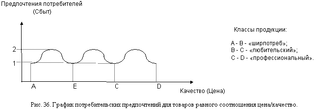 При равном соотношении цена/качество для различных марок одного товара график потребительских предпочтений никогда не является линейным. Потребитель относит все многообразие продукции к ограниченному количеству классов, чаще всего к трем классам: «ширпотреб» (низший), «любительский» (средний), «профессиональный» (престижный). При возникновении потребности покупка совершается в определенном классе товаров. Например, фотоаппарат для сына-второклассника может быть куплен в классе «ширпотреба»; для нужд семьи - в «любительском»; для работы или хобби - в «профессиональном».