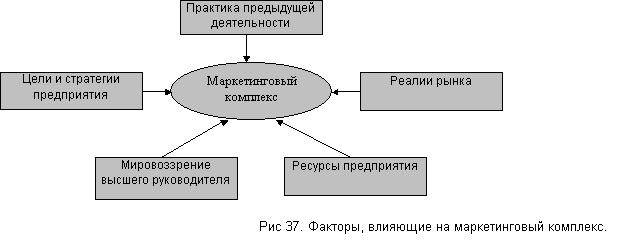 Консультирование по вопросам маркетинга имеет следующую специфическую особенность: очень часто руководитель предприятия априори считает, что маркетинговый комплекс определяется только рынком и наличием средств. Если уж строить маркетинг, то по «полной программе», чтобы обеспечивал и исследование рынка, и рекламу, и ценообразование, и управление сбытом, и все контрольные функции сразу. Реально на маркетинговый комплекс влияют следующие факторы (рис. 37):