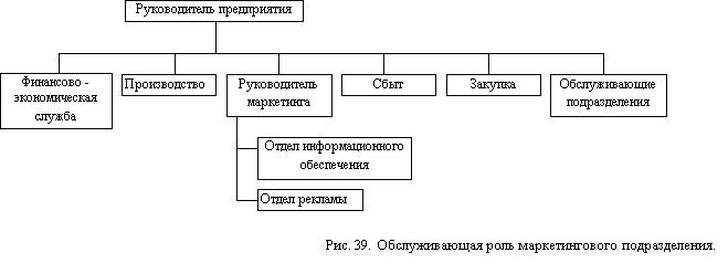 С точки зрения консультанта, формальная структура (схема подчиненности) службы маркетинга может быть любой, при условии, что она обеспечивает выполнение основных функций. Маркетинговые функции не сосредоточиваются в одном отделе, а распределяются между подразделениями. Для большинства российских предприятий, выделяющих в своей структуре подразделение маркетинга, характерны два основных вида интеграции маркетинга на предприятии: маркетинг как функция управления (рис. 38), и маркетинг как функция обслуживания (рис.39).