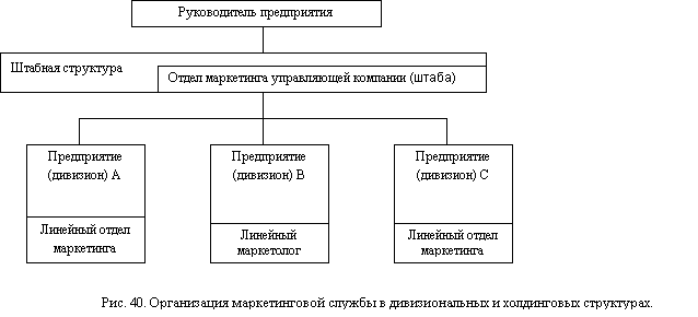 В холдинговых и дивизиональных структурах маркетинговая служба часто имеет два уровня (рис.40).
