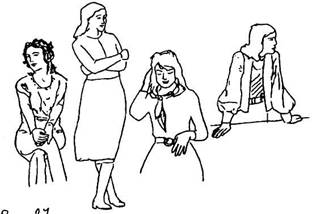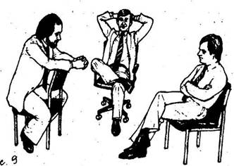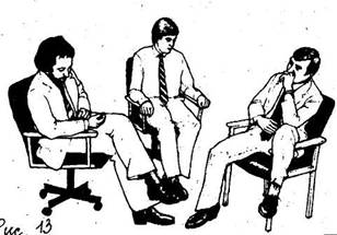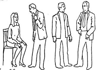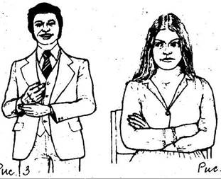 тесно сплетенные пальцы рук, особенно если руки находятся на коленях; поза на стуле «верхом»; руки в карманах, большие пальцы снаружи: у мужчин – амбициозность, у женщин - агрессивность |