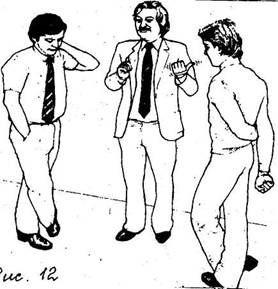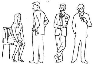 кисти рук соединены кончиками пальцев, ладони не соприкасаются; кисти рук сцеплены сзади, подбородок высоко поднят; во время передачи информации локти не прижаты к туловищу; руки в карманах, большие пальцы снаружи; одна рука обхватывает другую в области ладони |