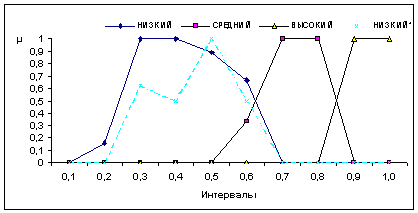 На рис.3 сплошными линиями показаны функции принадлежности значений лингвистической переменной «Уровень качества курса» после обработки таблицы, содержащей результаты опроса. Как видно из графика, функции принадлежности удовлетворяют описанным выше свойствам. Для сравнения пунктирной линией показана функция принадлежности лингвистической переменной для значения НИЗКИЙ без обработки данных.