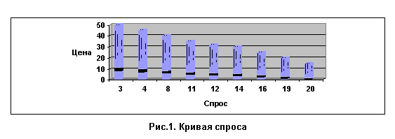 убывает, имея направления от левого верхнего угла чертежа к правому. Однако заметны отклонения от гладкого вида функции, связанные, в частности, с естественным пристрастием потребителей к круглым числам. Заметьте, все опрошенные, кроме одного, назвали числа, кратные 5 руб.