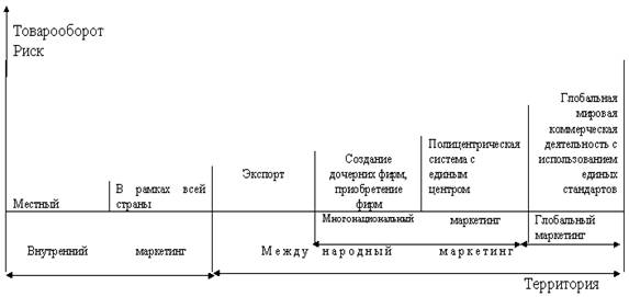 Приведенная выше периодизация развития маркетинга как философии предпринимательской деятельности была связана с производственной стороной бизнеса. Однако, маркетинг развивался во времени и пространстве. Его эволюции с точки зрения интернационализации маркетинговой деятельности представлена на рис.1.9.
