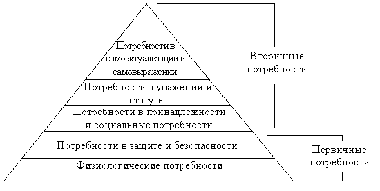Первые две группы потребностей первичны, а следующие три — вторичны. Согласно теории Маслоу все эти потребности можно расположить в строгой иерархической последовательности в виде пирамиды, основание которой составляют первичные, а вершиной являются вторичные потребности (рис. 5).