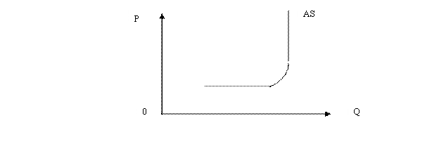 Фирмы могут приобрести факторы по твердым ценам, что позволяет сохранить производственные издержки на прежнем уровне, не повышать цены на товары. Горизонтальный отрезок кривой называется кейнсианским. Кейнс впервые в 30-х гг. доказал возможность и необходимость расширения общественного производства при неизменности уровня цен на ресурсы и продукцию. Он утверждал, что снижение цен и зарплаты не ведет к ослаблению спада реального объема производства и занятости.