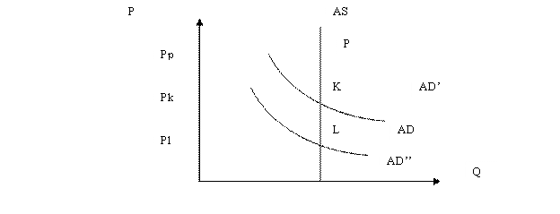 Если же при данном уровне совокупного спроса (кривая AD) количество денег сокращается, то AD уменьшается на величину отрезка KM, а кривая AD смещается в положение AD”. Так как предложение превышает спрос, цены начнут снижаться до уровня PL, которому будет соответствовать новое макроэкономическое равновесие (точка L).