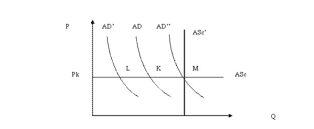 Кривая AS занимает горизонтальное положение, означая наличие свободных ресурсов, что позволяет надеяться на увеличение объема производства. Кейнсианский отрезок кривой AS распространяется от нулевого значения объема производства до объема, достигаемого при обеспечении полной занятости, при которой кривая AS принимает вертикальное положение.