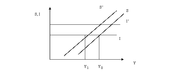 Если прирост сбережений не сопровождается приростом инвестиций, то любая попытка домохозяйств больше сберегать окажется тщетной в связи со значительным снижением равновесного ВНП, обусловленного эффектом мультипликации. Экономика стартует в точке А. В ожидании спада домохозяйства стремятся больше сберегать: график сбережений перемещается от S до S’, а инвестиции остаются на том же уровне. В результате потребительские расходы относительно снижаются, что вызывает эффект мультипликатора и спад совокупного дохода от Y0 до Y1.