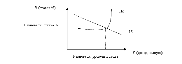 На кривой LM – чем выше уровень дохода, тем выше ставка процента. Увеличение предложения денег или снижение уровня цен сдвигает кривую LM вправо. Равновесие в модели достигается в точке пересечения кривых IS и LM.
