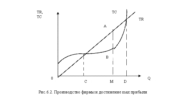 Отложим на оси абсцисс количество продукции, а на оси ординат – совокупные доходы и издержки (рис.6.2). Максимальная прибыль получается, когда разрыв между TR и TC наиболее велик (отрезок АВ). Точки С и D являются точками критического объема производства. До точки С и после точки D совокупные издержки превышают совокупный доход, такое производство убыточно. Именно в интервале производства от точки К до точки N фирма получает прибыль, максимизируя ее при выпуске, равном 0М. Задача – закрепиться в ближайшей окрестности точки В.