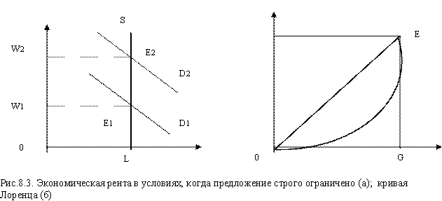 Первоначальный спрос на труд обозначен кривой D1, а предложение труда - S. В условиях неэластичного предложения цена на труд полностью зависит от спроса. Рост популярности работника (артиста, писателя) означает резкий сдвиг кривой спроса из положения D1 в положение D2. Таким образом, зарплата его повышается с w1 до w2. Площадь четырехугольника w1 Е1 Е2 w2 представляет собой экономическую ренту (рис.8.3а).