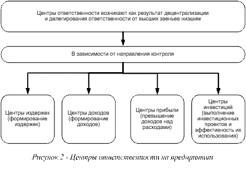 Структура мест возникновения затрат (см. рис. 1) стала основой для формирования информационной планово-учетной и организационной модели любого предприятия. Но сейчас этот вопрос решается иначе, через так называемые центры ответственности. Центр ответственности - это не структурное подразделение, в котором возникают какие-то издержки или доходы и т.д., а структурная единица, которая возникает как результат децентрализации и делегирования ответственности от высших уровней управления к низшим. Если высший менеджмент не передаст свои функции и не делегирует часть ответственности и соответственно прав на более низкие уровни управления, то в принципе выделить центр ответственности невозможно.