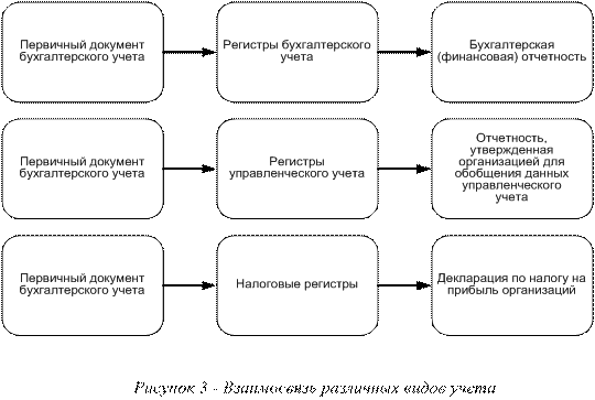 Общей информационной базой для составления регистров как финансового и управленческого, так и налогового учета является первичный учетный документ бухгалтерского учета. В различных видах финансовых, управленческих и налоговых регистров данная информация лишь группируется по различным основаниям в соответствии с задачами каждого вида учета. Областью пересечения финансового, управленческого и налогового учета является определение и распределение расходов, исчисление себестоимости готовой продукции, стоимости остатков незавершенного производства и др.