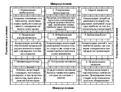 Данная модель представляет собой двумерную матрицу, где оси отражают сильные стороны предприятия и отраслевую привлекательность. Матрица разбита на 9 клеток, каждой из которых соответствует определенная стратегия. Имеющиеся позиции: