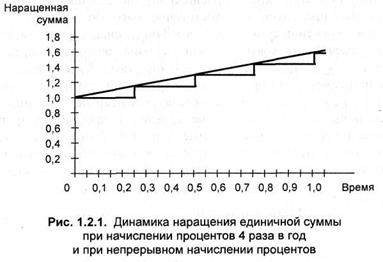 Рис. 1.2.1 иллюстрирует процесс наращения во времени единичной суммы при непрерывном наращении процентов (плавная зависимость) и ежеквартальном начислении процентов (ступенчатая зависимость) для годовой нормы доходности 60%. При ежеквартальном начислении процентов сумма остается неизменной в течение квартала, а в конце его увеличивается скачком в результате присоединения процентов, при непрерывном же начислении процентов сумма нарастает непрерывно. Поскольку оба процесса финансово эквивалентны, то значения наращенной суммы в конце каждого квартала совпадают независимо от способа начисления процентов.