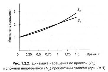 Сравним характер роста единичной суммы по простой процентной ставке и по непрерывной ставке сложных процентов при одинаковой годовой норме доходности. Как видно из рис. 1.2.2, в пределах одного года (0<t<1) рост по непрерывной сложной процентной ставке происходит медленнее, чем по простой. При сроке же, превышающем год, он идет значительно быстрее.