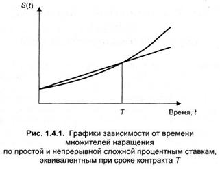 Графически это соотношение иллюстрирует рис. 1.4.1, где построены зависимости от времени множителей наращения по простой и непрерывной сложной процентным ставкам. Эти зависимости пересекаются в точке t=Т только в том случае, если простая процентная ставка равна (1.4.4).