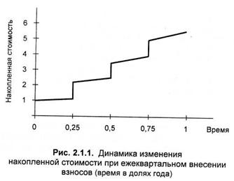 Очевидно, эта величина и есть накопленная сумма (стоимость) фонда при начислении простых процентов. Динамика изменения накопленной стоимости для примера 2.1.1 приведена на рис. 2.1.1.