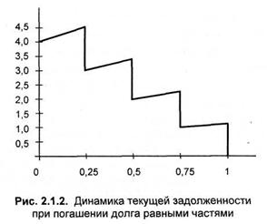 Если в какой-то момент времени заемщик решит досрочно погасить долг, то он должен выплатить сумму текущей задолженности, т. е. остаток основного долга и проценты, начисленные на этот остаток с момента последней выплаты. Динамика изменения текущей задолженности для примера 2.1.3 показана на рис. 2.1.2.