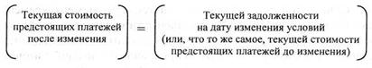 На практике часто возникает необходимость пересмотреть условия финансового контракта в связи с изменением финансового положения заемщика. Иногда необходимо заменить одно обязательство другим, с более отдаленным сроком исполнения или, наоборот, досрочно погасить задолженность, заменив совокупность платежей одним (консолидация платежей). При ухудшении финансового состояния заемщика часто возникает необходимость уменьшить расходы по обслуживанию займа, увеличив его срок. Возможных вариантов изменения условий конкретных финансовых контрактов довольно много, и нет смысла их рассматривать в общем виде. Достаточно сформулировать общее правило, которому должны удовлетворять параметры преобразованного контракта: