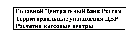 Структура управления ЦБР образована по вертикальному принципу. Территориальные управления ЦБР не являются юридическими лицами и поэтому не имеют право принимать решения, носящие нормативный характер, выдавать гарантии, поручительства и т.д. без разрешения совета директоров Головного Банка. Расчетно-кассовые центры - это отделения ЦБР на местах, занимающиеся обслуживанием корреспондентских счетов коммерческих банков.