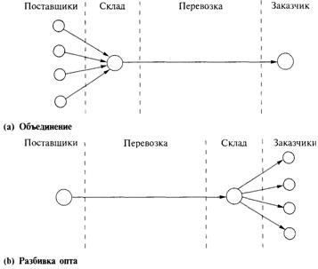 4. Сокращение затрат на перевозку. Многие потребители заказывают со складов партии «меньше чем вагон» или «меньше чем трейлер», что значительно увеличивает издержки, связанные с доставкой таких грузов. Для сокращения транспортных расходов склад может осуществлять унитизацию, т.е. объединение небольших партий грузов для нескольких клиентов, до полной загрузки транспортного средства. Еще одна форма объединения происходит в случае, когда заказчику необходимы МР от разных поставщиков (рис.3.1, а). Противоположная операция – разбивка опта – также позволяет сократить расходы на перевозку грузов от одного поставщика ко множеству заказчиков на определенной территории (рис.3.1, б).
