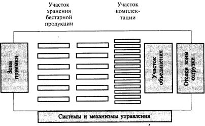 У этой схемы имеется множество вариантов. Наиболее типичный из них, применяемый в настоящее время в большинстве супермаркетов, – наличие двух зон хранения. Товары прибывают и помещаются в зону бестарного хранения – это основная зона хранения. Затем поступившие партии продукции разделяются на отдельные единицы, которые передаются в небольшое помещение для хранения, где из них комплектуется заказ. Заказ на необходимую продукцию комплектуется в этом небольшом складе, далее продукция поступает на участок объединения, а оттуда – в зону отгрузки. Когда запасы на участке комплектации снижаются, их пополняют с участка хранения бестарной продукции. Это обеспечивает поток материалов через зону приемки, участок хранения бестарной продукции, участок комплектации, участок объединения и зону отгрузки (рис.3.3).