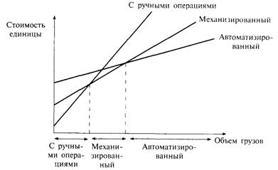 В целом более высокие объемы проходящих грузов требуют более высокого уровня автоматизации. Склады для небольших объемов грузов (например, в магазинах), как правило, используют ручные операции, для среднего объема грузов (склад продуктов питания) – механизированные, а для больших объемов грузов (склад продавца книг, заказываемых по электронной почте) – автоматизированные, что схематически показано на рис.3.4.