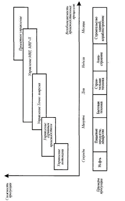 Рис. 3.1 иллюстрирует взаимосвязь между подходами к организации систем управления, сложностью производимой продукции (сложность в большинстве случаев может быть выражена в количестве составных частей и продолжительности технологического цикла) и возобновляемостью производственного процесса (определяется периодом или частотой выпуска однотипных изделий).