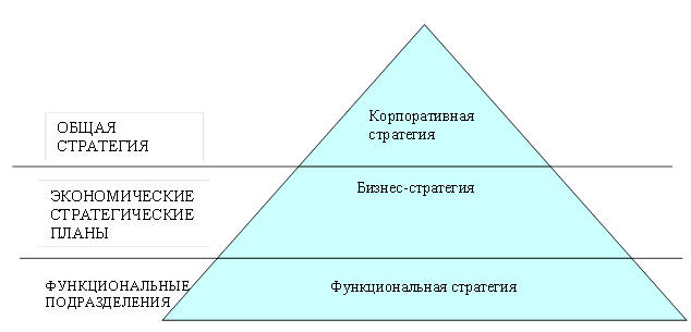 На уровне высшего руководства разрабатывается общая (корпоративная) стратегия, которая учитывает возможности компании занять определенную позицию на рынке на ближайшую перспективу. При этом учитывается ее собственная роль, осуществляемые виды деятельности, ожидаемый прирост эффекта и рентабельности. С учетом общей стратегии разрабатываются экономические стратегические планы, ориентированные на конкретные структурные подразделения. В экономических стратегических планах отображается ожидаемая прибыль, доля участия на рынке, ассортимент продукции и его обновление, возможные преимущества в сравнении с конкурентами.