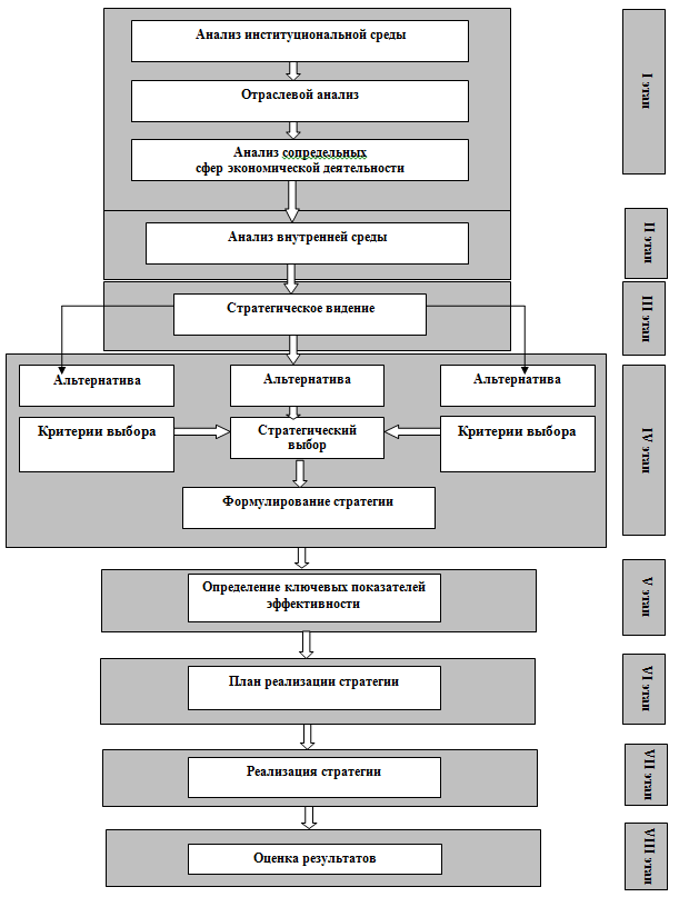 Процесс разработки и реализации корпоративной стратегии достаточно сложный и многоступенчатый. Он требует знания не только теоретических основ построения научно обусловленной стратегии, но и владения методами разработки конкретных практических действий, видения оптимальных стратегических альтернатив, разработки и принятия решений, умения спрогнозировать их результаты и своевременно скорректировать разработанную стратегию[69].