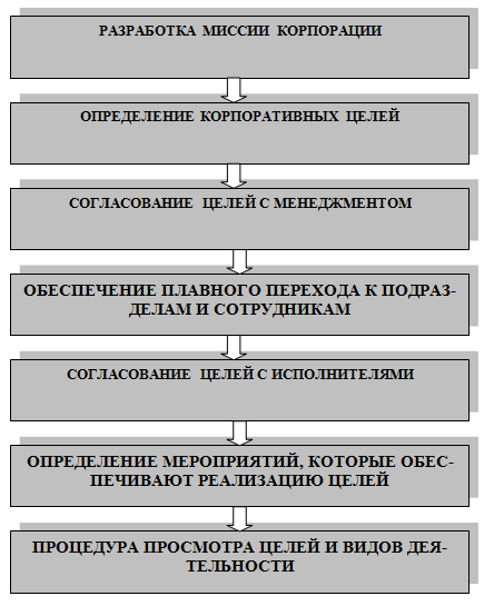 Миссия (основной замысел) и предпринимательская философия необходимы для установления стратегических целей корпорации, а также для завоевания доверия потребителей и других контактных групп, для избежания конфликта их интересов[72]. Миссия – это видение того, каким должно быть акционерное общество в будущем, система целей (долгосрочные и краткосрочные цели), желаемые результаты, которые отвечают пониманию цели. Ясно, что глобальной предпосылкой успешной разработки стратегии управления на любом уровне является правильное определение целей. Определение целей корпорации – способ прояснения стратегических и политических указаний организации, согласование дополнительных оперативных целей и задач. Это интегративный процесс, который связывает корпоративное планирование и бизнес-операции.[73] Этапы внедрения целей в корпорации изображены на рисунке 1.5.