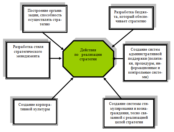Когда стратегический план разработан, перед менеджером встает задача реализации с положительным эффектом. Если, разработка стратегии это прежде всего предпринимательская деятельность, то ее реализация – это внутренняя административная деятельность.