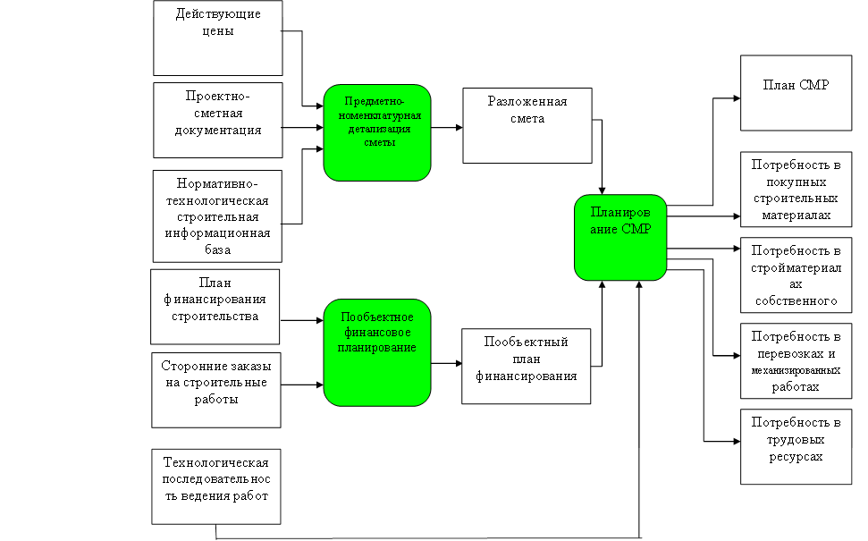 В результате, функция обеспечивает создание и оперативную корректировку плана строительно-монтажных работ и формирование плановых потребностей в покупных стройматериалах и стройматериалах собственного производства, потребностей в перевозках и использовании строительной техники (Рис. 3.3).