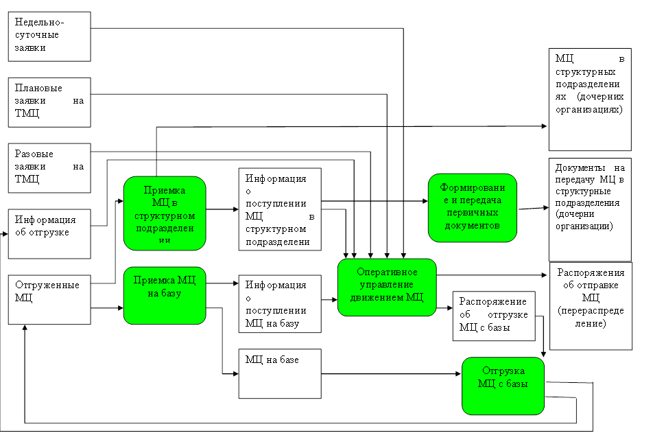 3) приемка материальных ценностей структурным подразделением (дочерней организацией). На входе – материальные ценности в пути, на выходе – наличие материальных ценностей в структурном подразделении (дочерней организации) и информация о поступлении материальных ценностей (дата поступления, ассортимент и количество материальных ценностей, вид и номер транспортного средства, отправитель). Информация передается от материально-ответственного лица структурного подразделения работнику соответствующей номенклатурной группы управления материально-технического обеспечения и контроля холдинг-компании в произвольном виде произвольным способом.