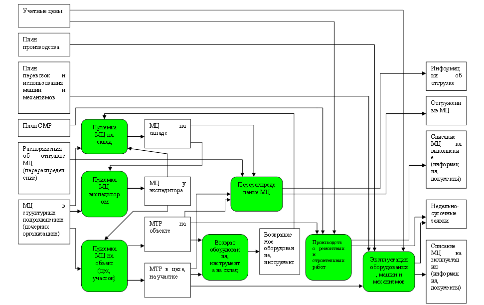 На выходе функция обеспечивает наличие материальных ценностей в структурных подразделениях – дочерних организациях (строительных, транспортных, производственных, ремонтных и др.) и распоряжения о перераспределении матценностей. Данная функция включает в себя следующее: