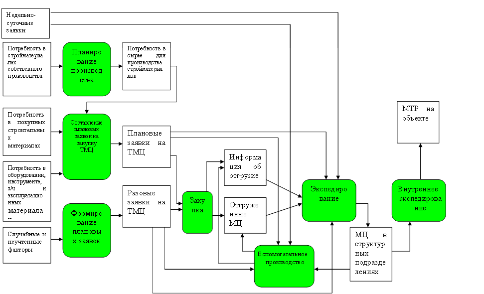 6) производство строительных и ремонтных работ. Производство работ по капитальному строительству и капитальному ремонту осуществляется согласно плана строительно-монтажных работ. В ходе работ расходуются материально-технические ресурсы, при учете расхода которых используются учетные цены. На выходе генерируются недельно-суточные заявки на стройматериалы, информация о расходе материально-технических ресурсов, в том числе первичные документы
