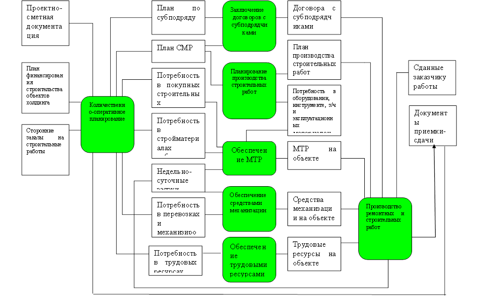 7. Производство ремонтных и строительных работ. Функция обеспечивает выполнение и сдачу объемов работ капитального строительства и капитального ремонта, формирование документов приемки-сдачи работ и формирование себестоимости строительно-монтажных работ и услуг субподрядчиков. При этом используется план производства строительных работ, обеспечения материально-техническими ресурсами, средствами механизации, трудовыми ресурсами, договорами с субподрядчиками и формирование учетных цен на ресурсы.
