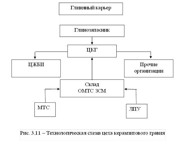 Технологическая схема цеха керамзитового гравия завода строительных материалов отображена на Рис. 3.11 Продукция – керамзитовый гравий. Мощности постоянно загружены, плана отгрузок нет. Для производства используются следующие ресурсы: глина керамзитовая; отработанное масло; газ.