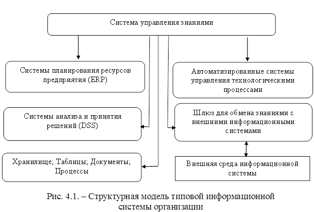 Самым нижним уровнем информационной системы является хранилище, в котором содержится вся интеллектуальная собственность строительной организации (документы, справочники, структурные таблицы, деловые правила и т.д.). Прямой доступ к хранилищу имеет лишь система управления знаниями, которая служит своего рода шлюзом для остальных систем и формирует информационное окружение корпорации. Система управления знаниями объединяет идеи, знания, содержание документов и деловые правила, автоматизируя процессы, базирующиеся на знаниях, как внутри самого строительного холдинга, так и между его структурными подразделениями (дочерними организациями).