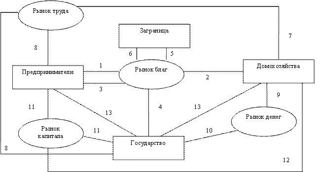 1- предложение благ, 2 – спрос на блага домохозяйств, 3 – спрос на инвестиции, 4 – спрос на блага государства, 5 – экспорт, 6 – импорт, 7 – предложение труда, 8 – спрос на труд, 9 – спрос на деньги, 10 – предложение денег, 11 – предложение ценных бумаг, 12 – спрос на ценные бумаги, 13 – налоги.
